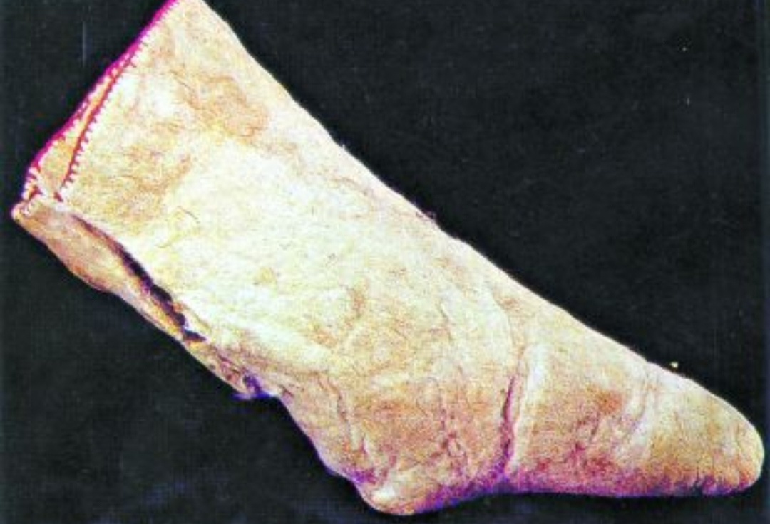 专家在20世纪末长沙出土的马王堆一号西汉墓中发现了两双丝绸袜子。他们的丝袜高度分别为21厘米和22.5厘米,头宽分别为10厘米和8厘米,嘴宽分别为12.7厘米和12厘米。这是两双无缝底用丝绸缝制的袜子。由此,专家得出结论:早在2000多年前,中国就有了相对成熟的袜子缝制工艺。